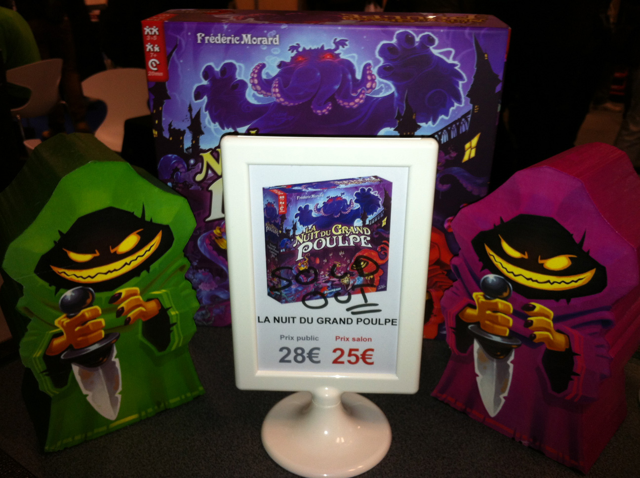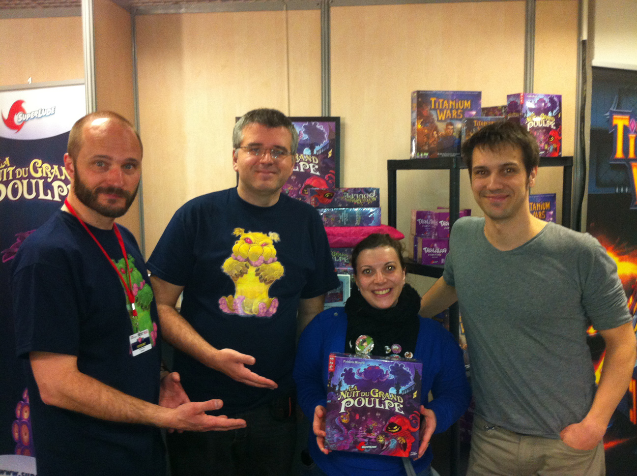 Comme de nombreux visiteurs et exposants, je suis rentré de Cannes lundi. Extrêmement crevé et absolument enchanté de ce séjour ludique. Notre stand n’a pas désemplit et La Nuit Du Grand Poulpe à reçu un très bon accueil du public mais aussi des autres éditeurs, venus acheter ou jouer à notre bébé poulpesque, sold out le dimanche midi avec pas moins de 100 ventes ! Après tant de bonnes choses, des remerciements s’imposent : Pour tous les joueurs, les associations, les ludothèques, les éditeurs, les journalistes et les auteurs qui se sont intéressé à Superlude et à ses jeux. Pour ceux et celles avec qui j’espère avoir sympathisé. Pour ceux et celles qui m’ont aidé à prendre le tgv du retour en portant une partie du stand que je traînais depuis l’appart de location . Remerciement aussi au staff d’EUPHORIA GAMES avec qui nous partagions le stand. Merci, 1000 fois merci aussi à Fred, Alex et Djib qui ont tous fait un super boulot ce WE ! Et merci aussi à Guillaume, Igor, Rodolphe et Vincent qui suivent et épaulent ma petite entreprise depuis le début et pour longtemps j’espère. Merci aux 2 auteurs qui ont accepté de me confier leurs jeux alors que je n’étais pas seul sur le coup ! Merci à l’orga du festival aussi bien sur. A l’année prochaine avec plein de nouveaux jeux !